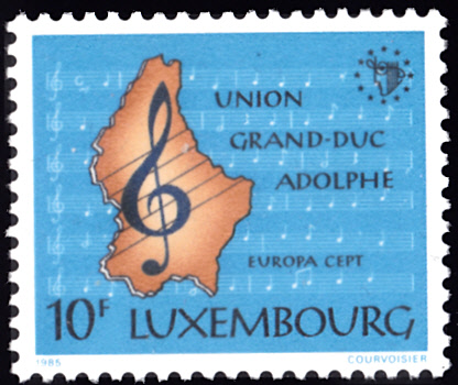 In Luxemburg erschienen die Europamarken 1985 am 8. Mai 1985 zum Gemeinschaftsthema "Europäisches Jahr der Musik". Hier die Marke zu 10 Franc mit einem Violinschlüssel, einer Landkarte von Luxemburg und Anfangstakte der Nationalhymne. Die Auflage der Marke betrug 600 000 Stück.