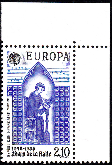 In Frankreich erschienen die Europamarken 1985 am 27. April zum Gemeinschaftsthema "Europäisches Jahr der Musik". Hier die Marke zu 2,10 Fr mit einer Abbildung von Adam de la Halle (um 1237-1286, Dichter und Komponist), die in einer Auflage von 10 000 000 Stück erschien.