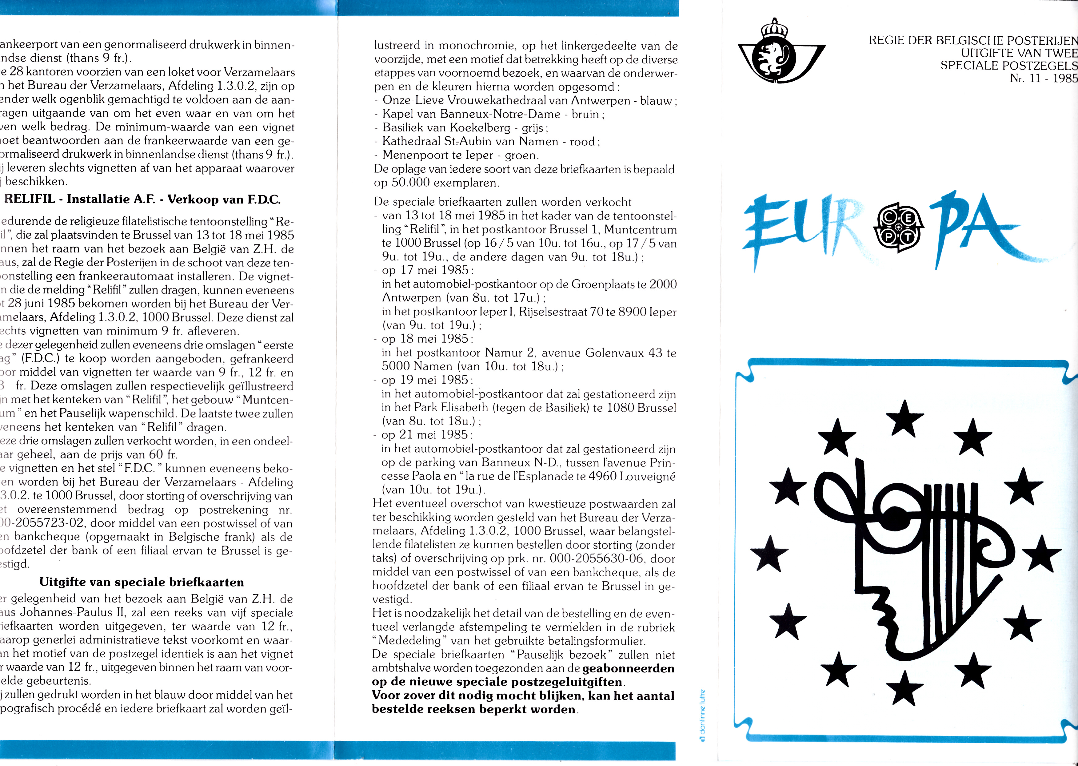 Hier zeige ich die Ankündigung der belgischen Post zu dieser Ausgabe. Darin wurden genauere Angaben zur Markenausgabe bekannt gegeben. Das im Michel vermerkte Ausgabedatum 11.5.1985 bezieht sich auf die fünf "Vorkaufsstellen". Erst am 13.5.1985 waren die Marken bei allen Postämter zu erwerben.