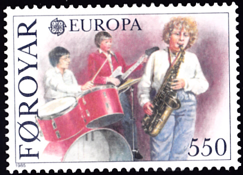 In Dänemark Färöer erschienen die Europamarken 1985 zum Gemeinschaftsthema "Europäisches Jahr der Musik" am 2. Mai 1985. Hier die Marke zu 3,80 Kronen mit einer Abbildung zum Thema "Jugendliche spielen moderne Musik". Die Marke hat eine Auflage von 1 108 000 Stück.