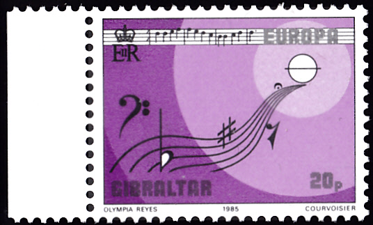 In Gibraltar erschienen die Europamarken 1985 zum Gemeinschaftsthema "Europäisches Jahr der Musik" am 26. Februar 1985. Hier die Marke zu 20 Pence mit der Bassstimme der Europahymne und Notenzeichen.