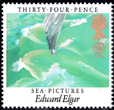In Großbritannien erschienen die Europamarken 1985 am 14. Mai zum Gemeinschaftsthema "Europäisches Jahr der Musik". Hier die Marke zu 34 Pence mit einer Darstellung zu "Seebilder" einem Liederzyklus von Edward Elgar (1857-1934), die in einer Auflage von 6 806 100 Stück erschien.