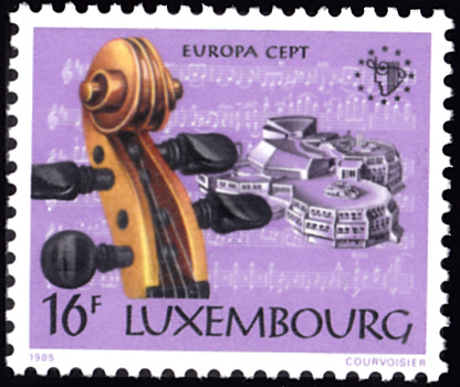 In Luxemburg erschienen die Europamarken 1985 am 8. Mai 1985 zum Gemeinschaftsthema "Europäisches Jahr der Musik". Hier die Marke zu 16 Franc mit dem Hals einer Violine, dem Musikkonservatorium und Noten aus dem Violinkonzert op. 61 von Beethoven. Die Auflage der Marke betrug 600 000 Stück.