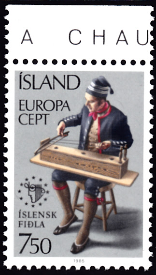 In Island erschienen die Europamarken 1985 am 3. Mai 1985 zum Gemeinschaftsthema "Europäisches Jahr der Musik". Hier die Marke zu 7,50 Kronen mit einem Frau mit Mann mit isländischer Geige. Die Auflage der Marke betrug 1 500 000 Stück.