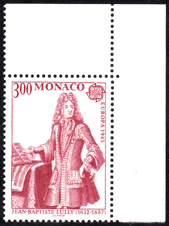 In Monaco erschienen die Europamarken 1985 am 23. Mai 1985 zum Gemeinschaftsthema "Europäisches Jahr der Musik". Hier ein Eckrandstück der Marke zu 3,00 Fr mit einer Abbildung von Jean-Baptiste Lully (1632-1687, Komponist), die in einer Auflage von 269 577 Stück erschien.