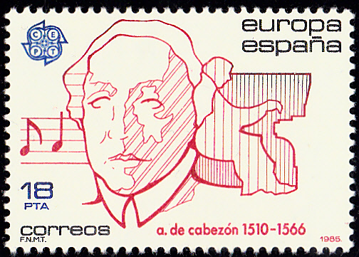 In Spanien erschienen die Europamarken 1985 am 3. Mai 1985 zum Gemeinschaftsthema "Europäisches Jahr der Musik". Hier die Marke zu 18 Pta mit einer Abbildung von Antonio de Cabezón (1510-1566, Komponist und Organist), die in einer Auflage von 6 000 000 Stück erschien.