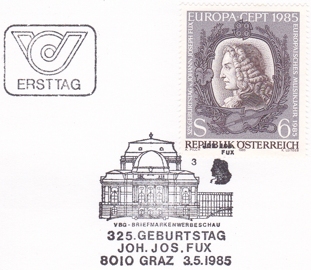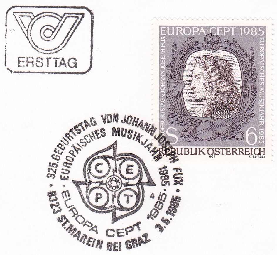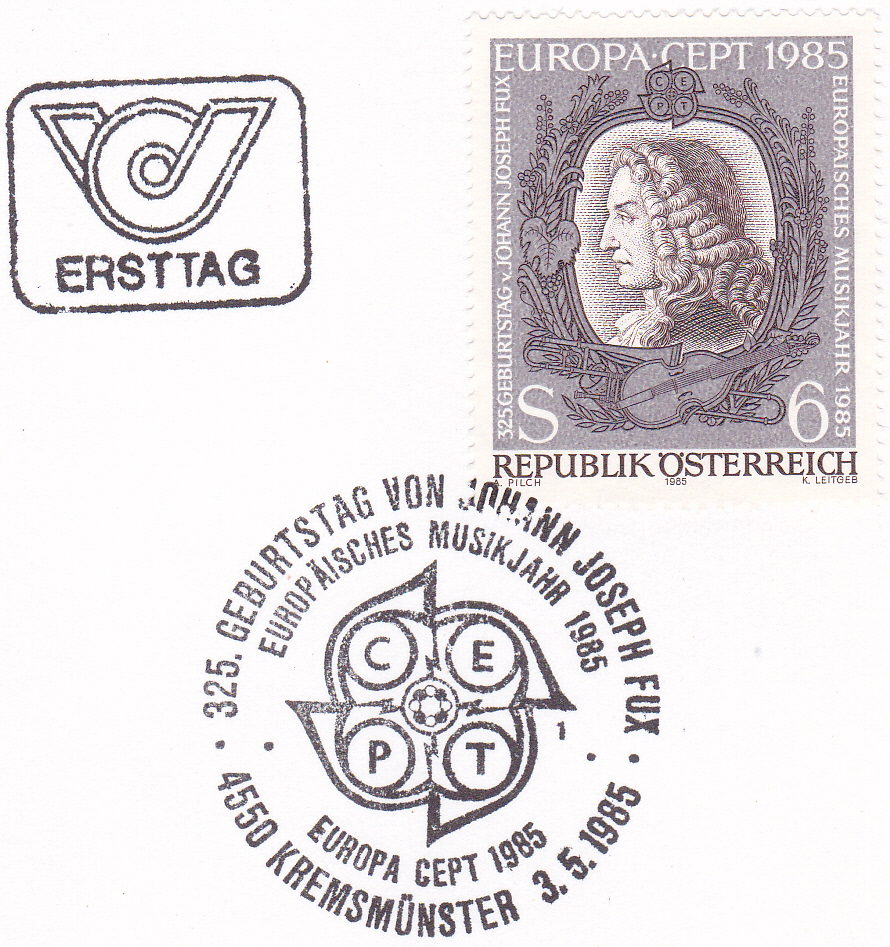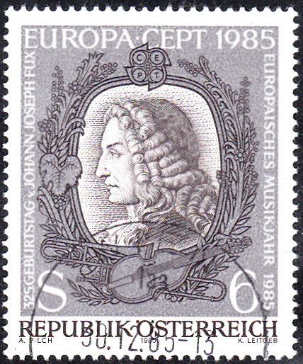 In Österreich erschien eine Europamarke 1985 am 3. Mai 1985 zum Gemeinschaftsthema "Europäisches Jahr der Musik". Hier diese Marke zu 6 Schilling mit einem Porträt von Johann Joseph Fux (1660-1741, Komponist und Musiktheoretiker ), die in einer Auflage von 3 800 000 Stück erschien.