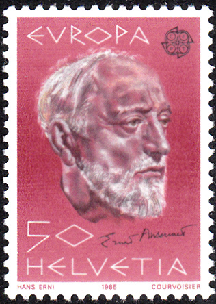 In der Schweiz erschienen die Europamarken 1985 am 7. Mai 1985 zum Gemeinschaftsthema "Europäisches Jahr der Musik". Hier die Marke zu 50 Rappen mit einem Porträt von Ernest Ansermet (1883-1969, Dirigent), die in einer Auflage von 41 679 000 Stück erschien.