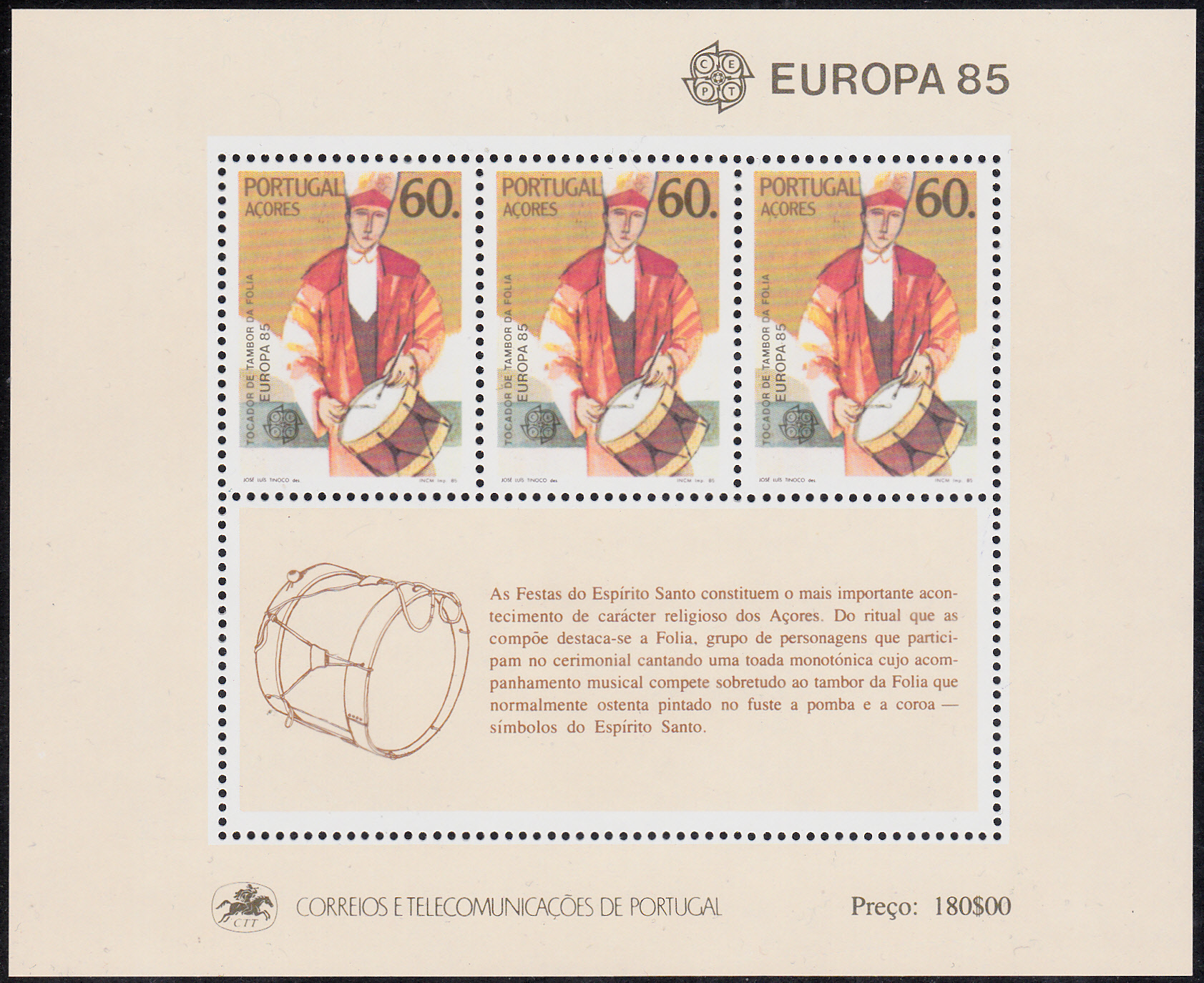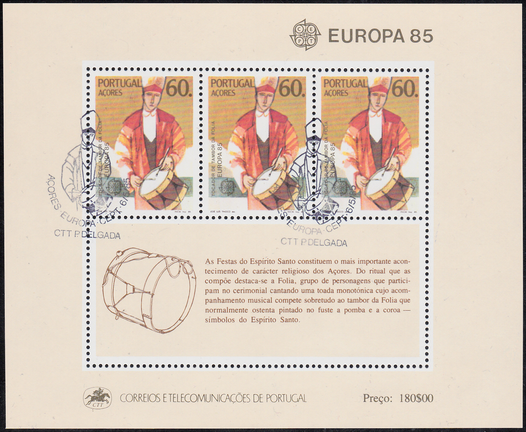 Die Europamarke 1985 erschien in Portugal Azoren am 6. Mai 1985 auch als Block mit drei Marken zu 60,00 Escudo mit der Abbildung eines Musikanten mit "Folia" (Trommel). Die Auflage betrug 300 000 Blocks.