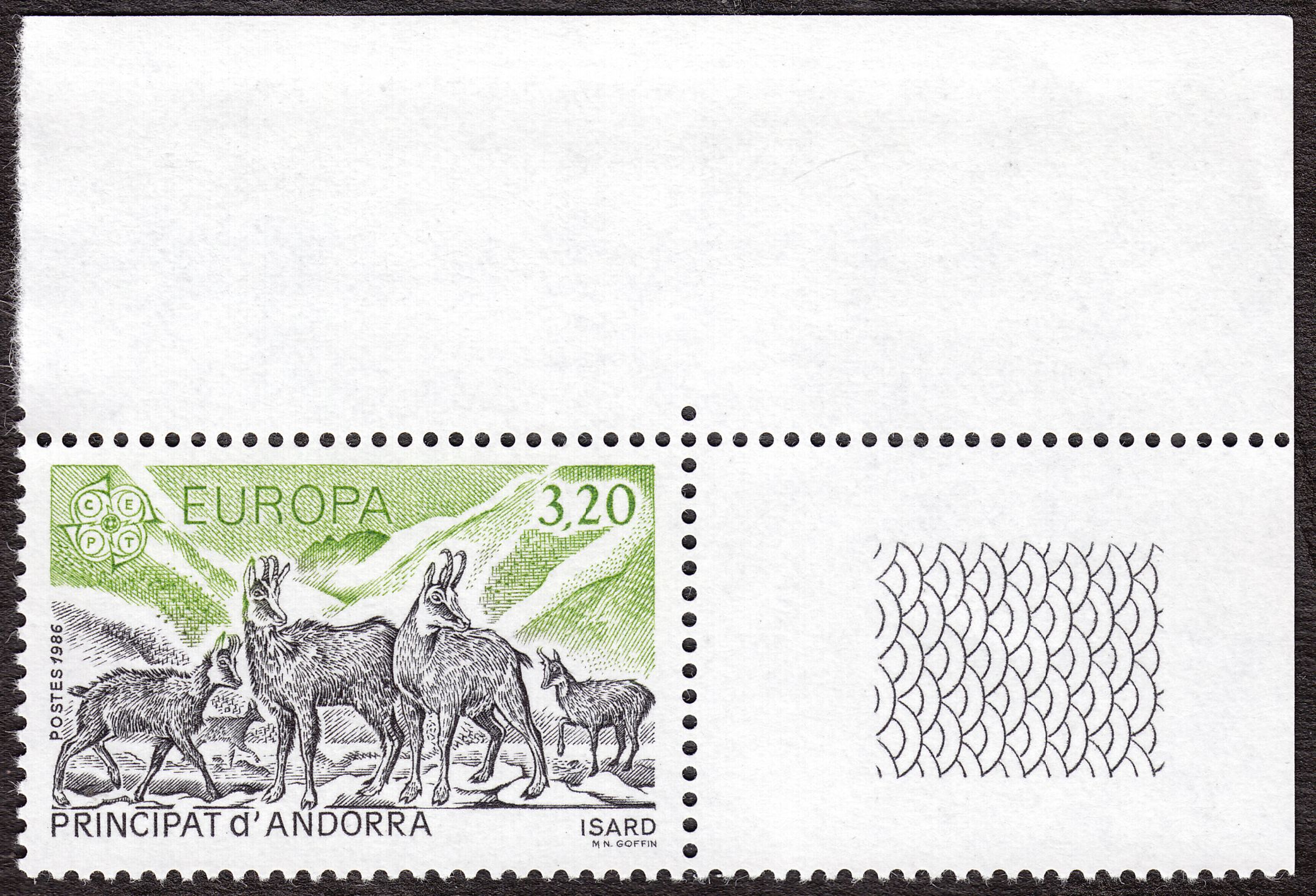Die Europamarke 1986 zu 3,20 Francs zeigt Pyrenäen-Gämsen (Rupicapra pyrenaica), eine in Südeuropa lebende Paarhuferart, die eng mit der auch in Mitteleuropa vorkommenden (eigentlichen) Gämse verwandt ist, hier ein postfrisches Exemplar vom Eckrand 2:
