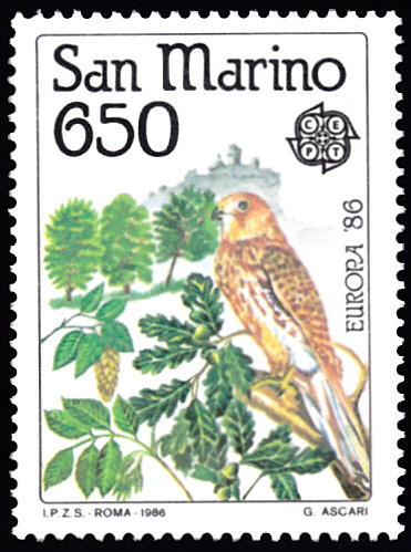 In San Marino sind die Europamarken 1986 zum Gemeinschaftsthema "Natur- und Umweltschutz" am 22. Mai 1986 erschienen. Hier eine Marke zu 650 Lire mit der Abbildung mit einem Turmfalken (Falco tinnunculus) und Pflanzen. Die Auflage betrug 385 723 Stück.