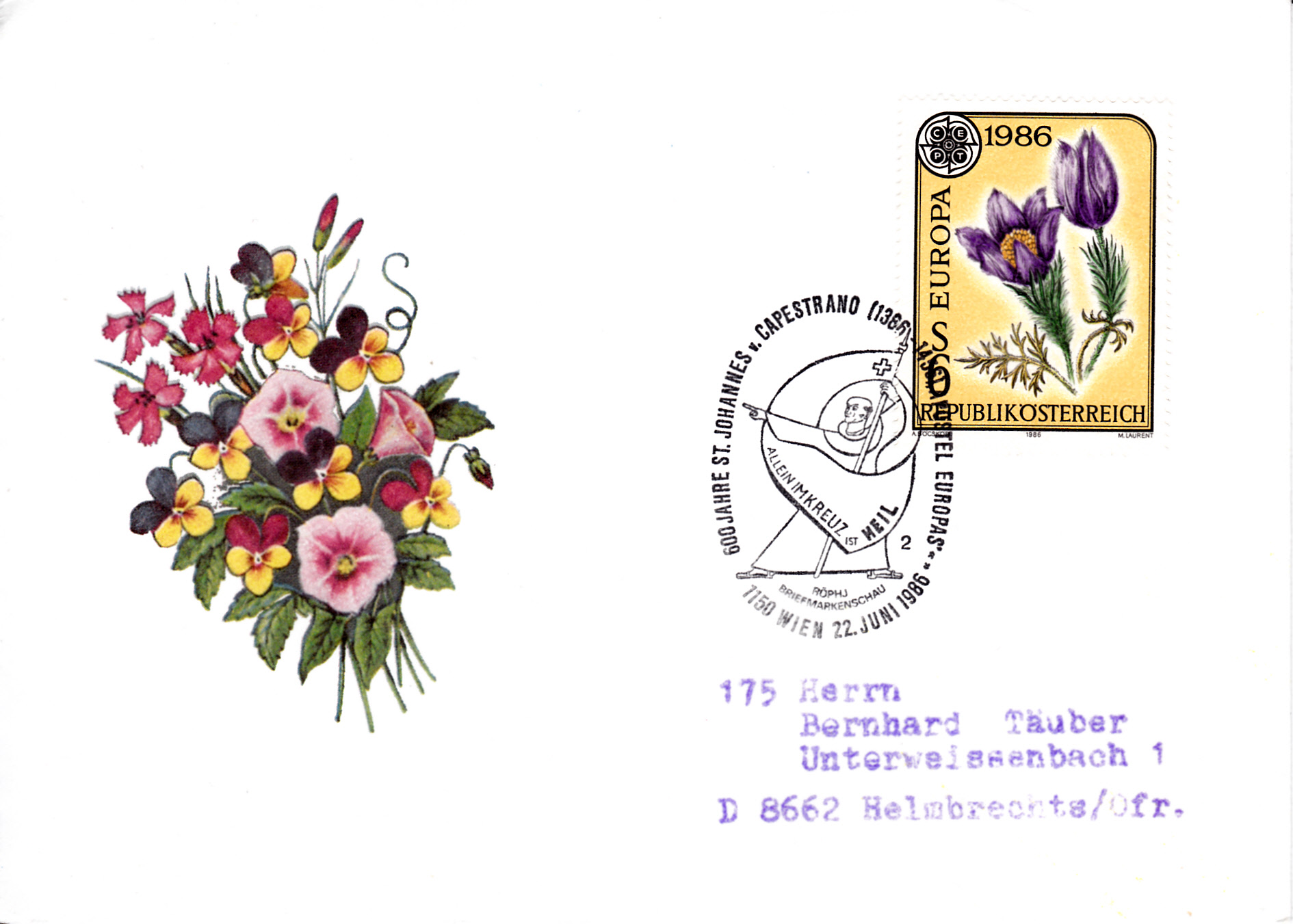 Brief mit der Europamarke 1986 und einem Sonderstempel vom 22.6.1986 aus Wien mit Europabezug (Apostel Europas). Der Stempel hat die Kennziffer "2".