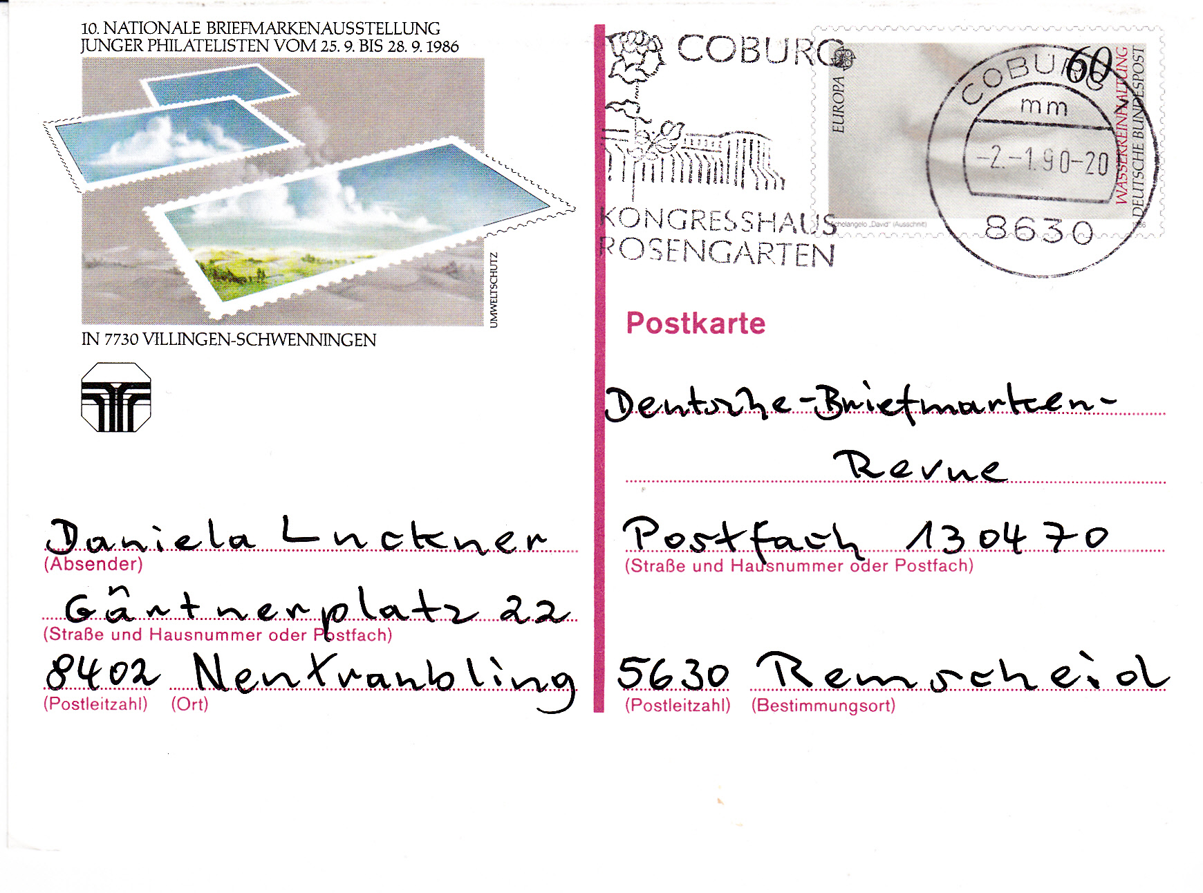 Sonderpostkarte mit dem Wertzeicheneindruck der 60Pf Europamarke 1986 (MiNr PSo 13) zur NAJUBRIA '86 in Villingen-Schwenningen als Einschreiben mit Luftpost nach Australien mit dem Sonderstempel zur NAJUBRIA 1986 "Tag der Umwelt". Das Porto betrug für eine Auslandspostkarte 70, für Einschreiben 200Pf und Luftpost Zone 4 40Pf, daher war zusätzlich zum Wertstempel ein Automatenmarke zu 250Pf notwendig.