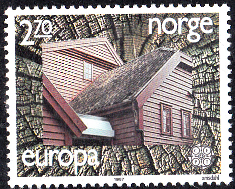 In Norwegen erschienen die Europamarken 1987 zum Gemeinschaftsthema "Moderne Architektur" am 3. April 1987. Hier die Marke zu 2,70 Kronen mit der Abbildung einer "Holzarchitektur", die in einer Auflage von 11 448 173 Stück erschien.