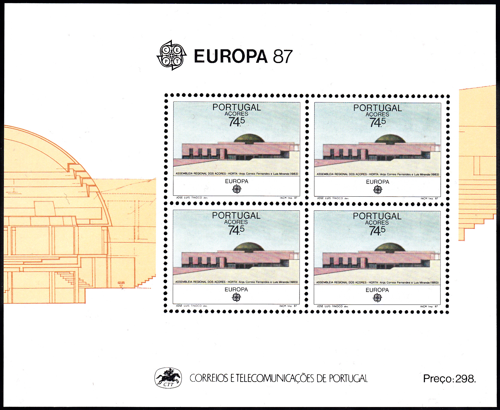 Die Europamarke 1987 erschien in Portugal Azoren am 5. Mai 1987 auch als Block mit vier Marken zu 74,50 Escudo mit einem Bild vom Gebäude der Regionalversammlung in Horta der Architekten Manuel Correia Fernandes (geb. 1941) und Luís Miranda. Die Auflage betrug 200 000 Blocks.
