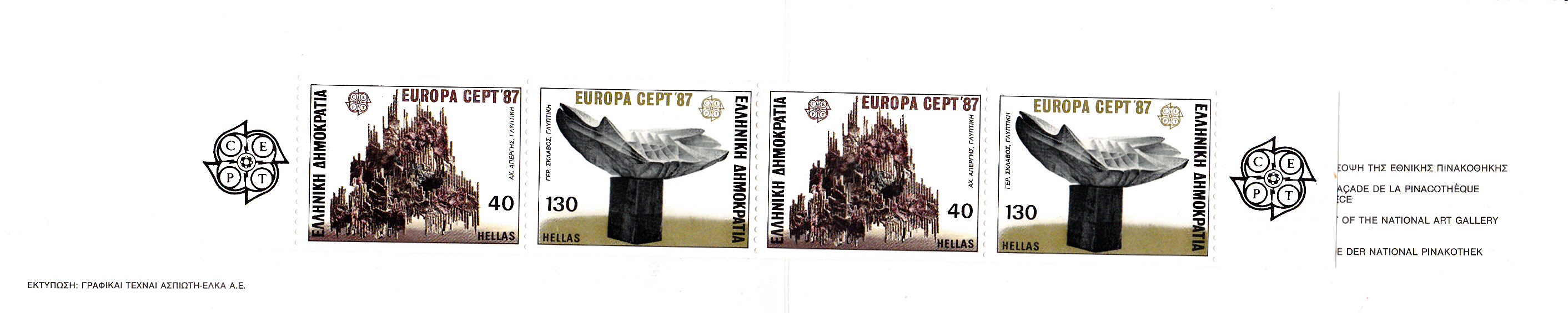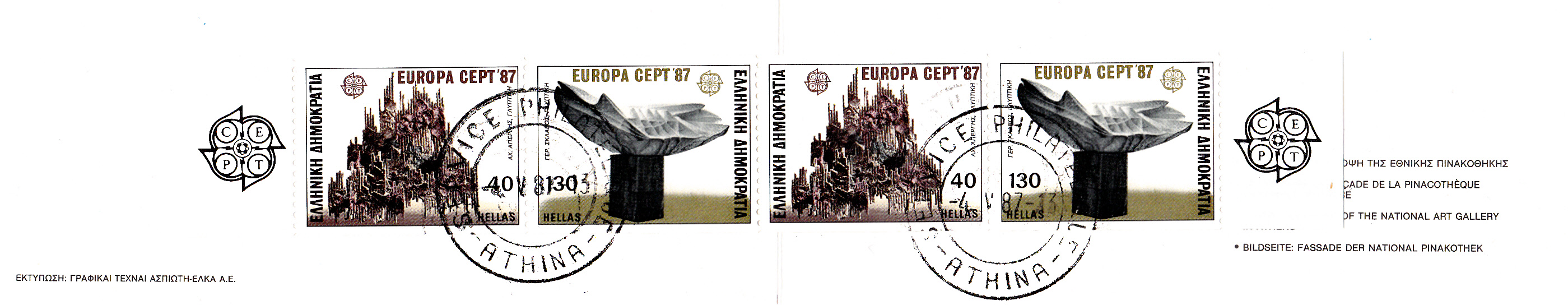 In Griechenland erschienen die Europamarken 1987 zum Gemeinschaftsthema "Moderne Architektur" am 4. Mai 1987. Hier die Marke zu 40 Drachmen mit der Abbildung einer Plastik von Achilleas Apergis (1909-1986). Die Marke gibt es in zwei Versionen: A = vierseitig gez. K 12 1/2 (aus dem Bogen mit 2x4 Zusammendrucken) und C = senkrecht gez. 12 3/4 (aus Markenheftchen). Die Auflage der Marke beträgt 1 500 000 Stück aus dem Bogen und 300 000 Stück aus Markenheftchen.