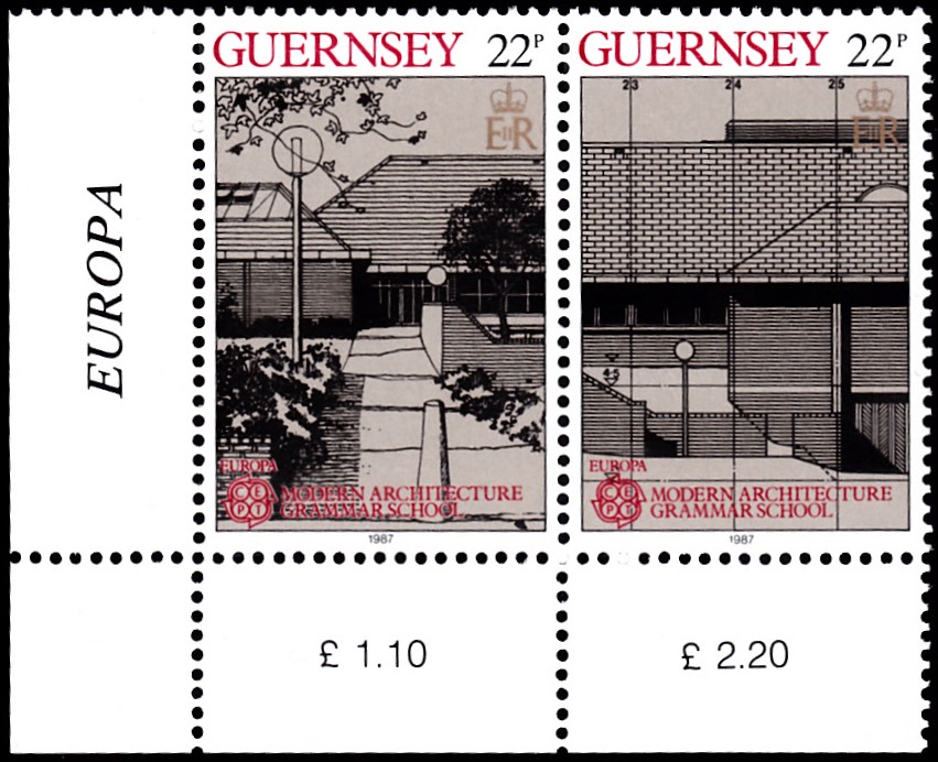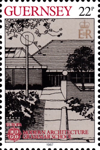 In Großbritannien-Guernsey erschienen die Europamarken 1987 zum Gemeinschaftsthema "Moderne Architektur" am 5. Mai 1987. Hier eine Marke zu 22 Pence mit einer Grundschule.