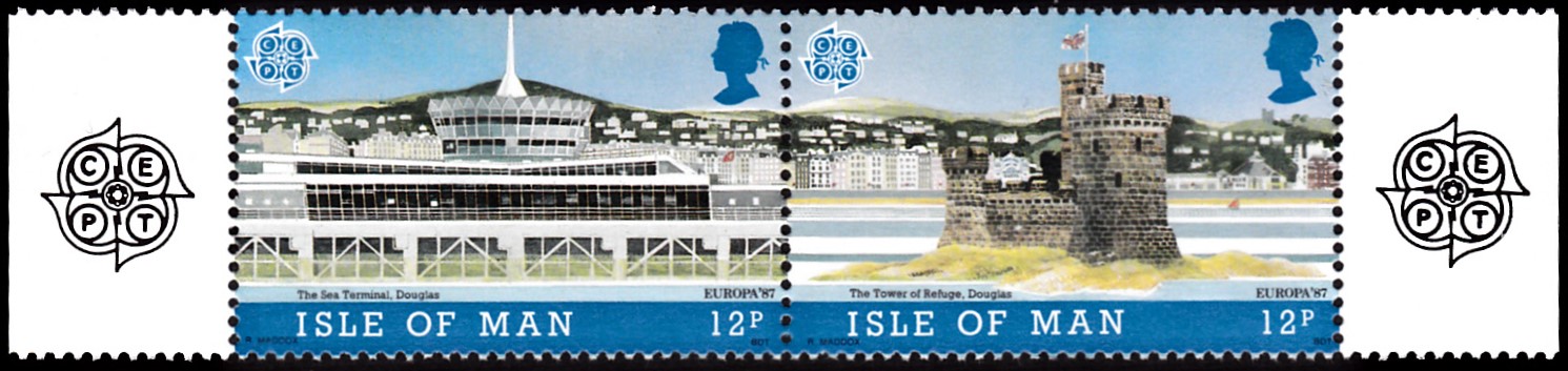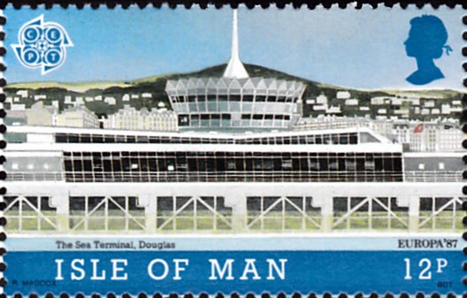 In Großbritannien-Isle of Man erschienen die Europamarken 1987 zum Gemeinschaftsthema "Moderne Architektur" am 29. April 1987. Hier eine Marke zu 12 Pence mit dem Abfertigungsgebäude im Hafen von Douglas.