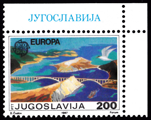 In Jugoslawien erschienen die Europamarken 1987 zum Gemeinschaftsthema "Moderne Architektur" am 30. April 1987. Hier die Marke zu 200 Dinar mit der Tito-Brücke zur Insel Krk von Ilija Stojadinović (1924-2007). Die Auflage dieser Marke betrug 400 000 Stück.