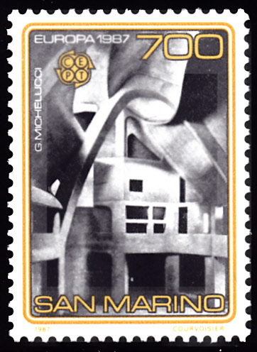 In San Marino erschienen die Europamarken 1987 zum Gemeinschaftsthema "Moderne Architektur" am 12. März 1987 mit Darstellungen zur Kirche "Maria zum Trost" in Borgo Maggiore di San Marino von Giovanni Michelucci (1891-1990, italienischer Architekt und Stadtplaner). Hier die Marke zu 700 Lire mit einer Innenansicht der Kirche. Die Auflage der Marke beträgt 400 000 Stück.