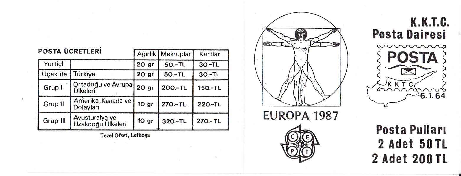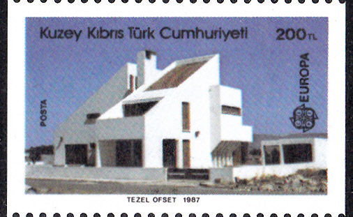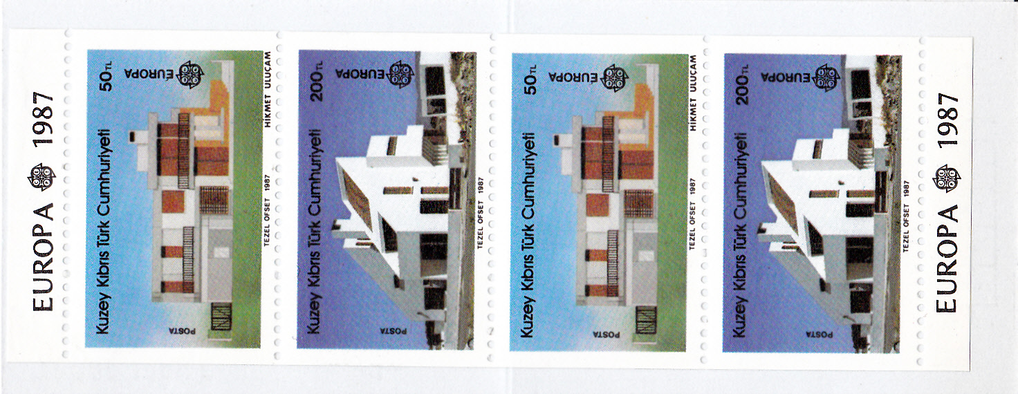 In Türkisch-Zypern erschienen die Europamarken 1987 zum Gemeinschaftsthema "Moderne Architektur" am 30.Juni 1987. Die Marke zu 200 TL mit der Abbildung eines Wohngebäude von Necdet Turgay gibt es in zwei Varianten: A = vierseitig gez. K 12 1/4 aus dem Bogen und C = waagerecht gez. 12 1/4 aus Markenheftchen.