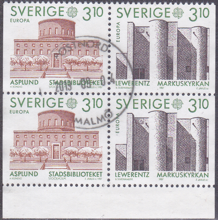 In Schweden erschienen die Europamarken 1987 zum Gemeinschaftsthema "Moderne Architektur" am 14. Mai 1987. Hier eine Marke zu 3,10 Kronen mit der Stadtbibliothek in Stockholm von Gunnar Asplund (1885-1940). Die Auflage der Marke beträgt 4 740 000 Stück.