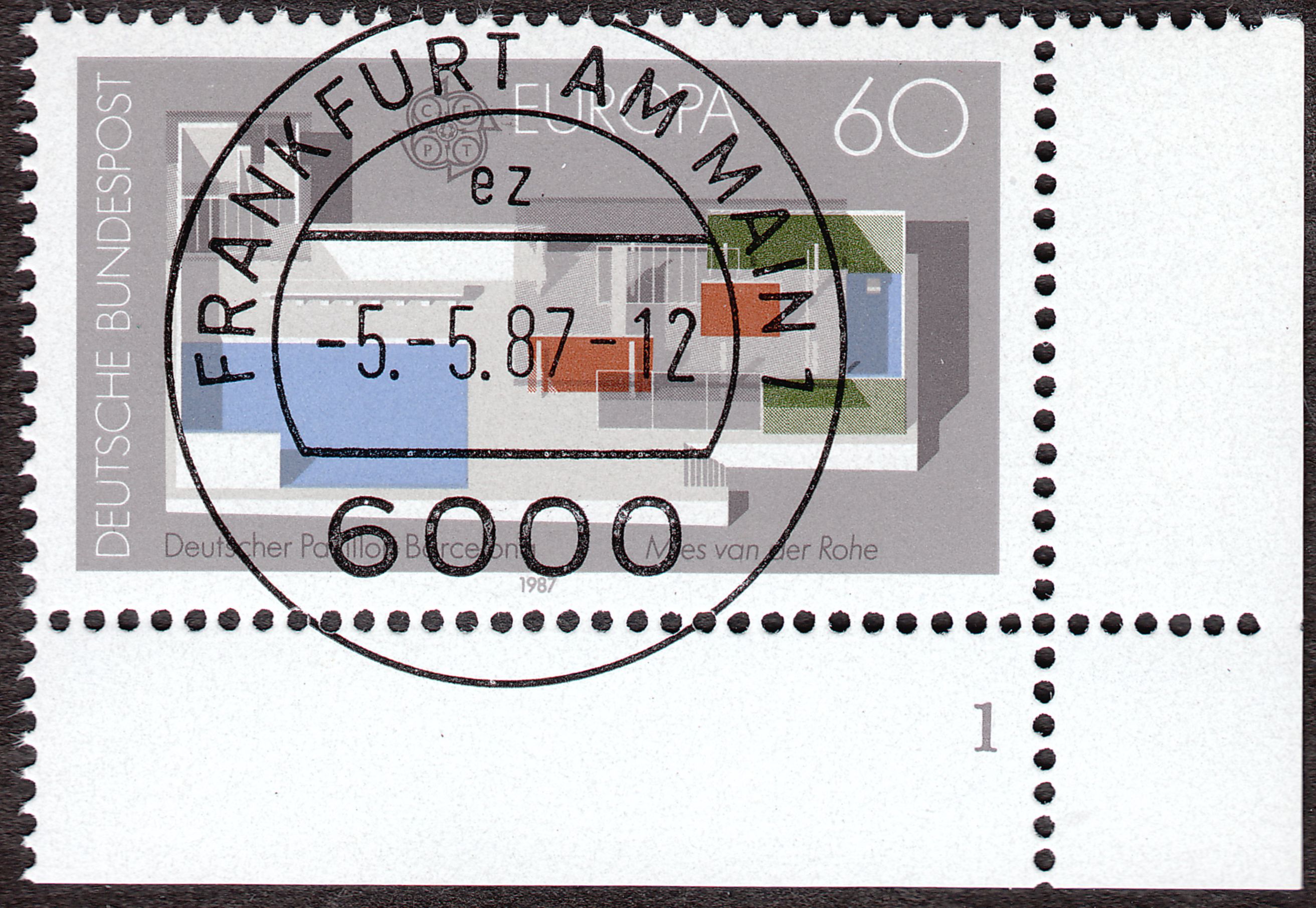 Exemplar vom Eckrand 4 mit Formnummer "1", entwertet in der Versandstelle für Sammlermarken in Frankfurt am Main: