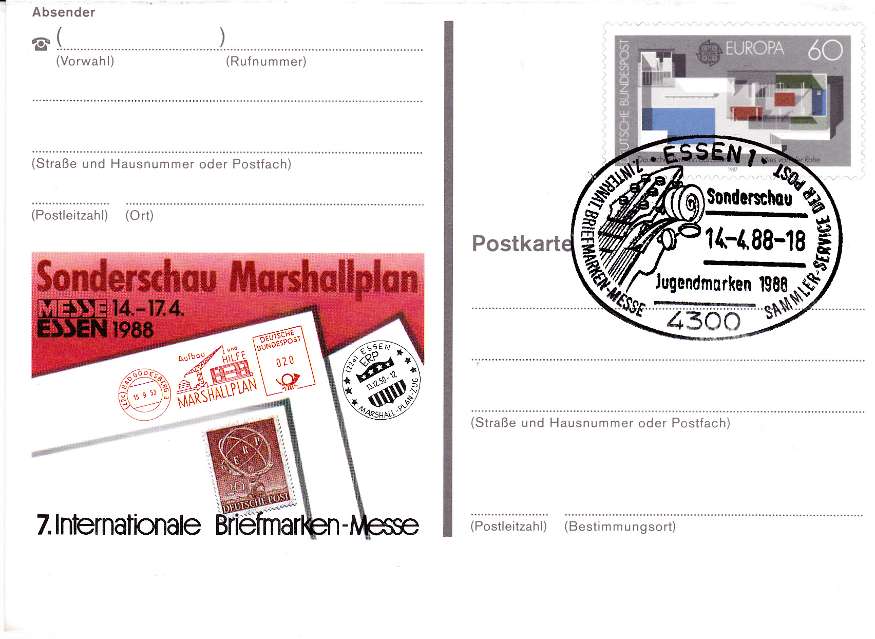 1988 erschien zur Briefmarkenmesse in Essen eine Sonderpostkarte (MiNr PSo 16) mit dem Wertzeicheneindruck der Europamarke 1987.