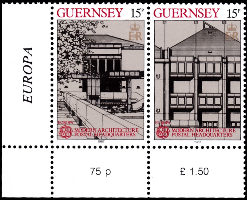 In Großbritannien-Guernsey erschienen die Europamarken 1987 zum Gemeinschaftsthema "Moderne Architektur" am 5. Mai 1987. Hier eine Marke zu 15 Pence mit dem Postamt in St. Peter Port.