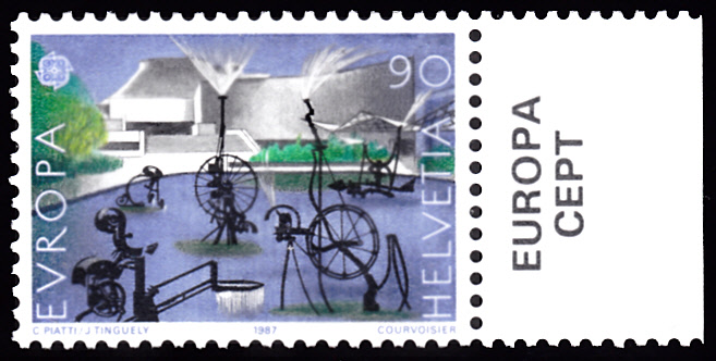In der Schweiz erschien eine Europamarke 1987 zum Gemeinschaftsthema "Moderne Architektur" am 26. Mai 1987. Hier die Marke zu 90 Rappen mit der Abbildung des Basler Fasnachtsbrunnen mit Skulpturen von Jean Tinguely (1925-1991). Die Auflage der Marke beträgt 7 530 000 Stück.