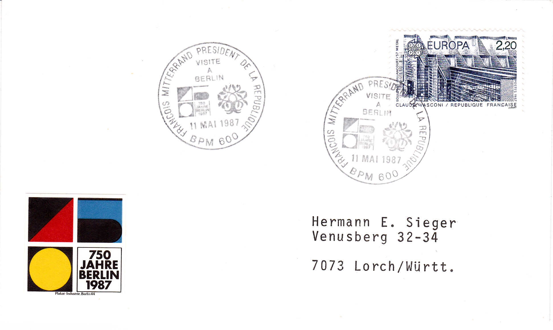 Auf diesem Umschlag wurde die Europamarke 1987 zu 2,20Fr mit einem Sonderstempel des französischen Armepostamtes zum Besuch der französischen Präsidenten in Berlin gestempelt.