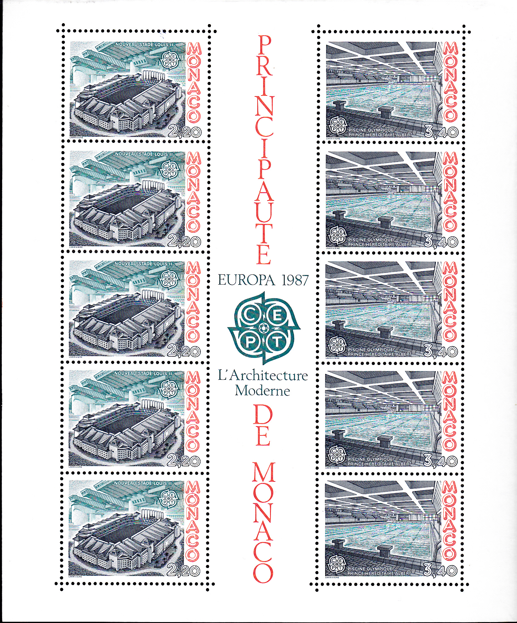 In Monaco erschienen die Europamarken 1987 zum Gemeinschaftsthema "Moderne Architektur" am 23. April 1987. Neben den Einzelmarken erschien auch noch ein Block mit jeweils fünf Marken zu 2,20 Fr (MiNr 1794) und 3,40 Fr (MiNr 1795). Die Auflage betrug 228 213 Blocks.
