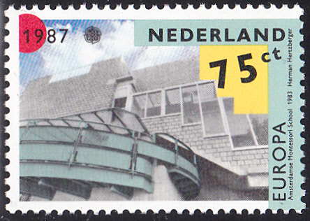 In den Niederlande erschienen die Europamarken 1987 zum Gemeinschaftsthema "Moderne Architektur" am 12. Mai 1987. Hier die Marke zu 75 Cent mit der Abbildung der Montessorischule, Amsterdam von Herman Hertzberger (geb. 1932). Die Auflage der Marke beträgt 11 905 300 Stück.