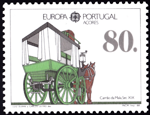 In Portugal-Azoren erschien eine Europamarke 1988 zum Gemeinschaftsthema "Transport- und Kommunikationsmittel" am 21. April 1988. Hier diese Marke zu 80 Escudo mit der Abbildung eines Pferdeomnibusses auf São Miguel (19. Jh.), die in einer Auflage von 600 000 Stück erschien. Die Hintergrundfarbe dieser Marke ist weiß. Sie unterscheidet sich von der Marke aus dem Block, die Blockmarke hat die Hintergrundfarbe weißgelborange.