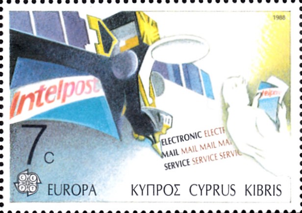 In Zypern erschienen die Europamarken 1988 zum Gemeinschaftsthema "Transport- und Kommunikationsmittel" am 9. Mai 1988. Hier eine Marke zu 7 Cent mit einem Satelliten und einem Mann mit Telebrief. Die Marke erschien in einer Auflage von 500 000 Stück.