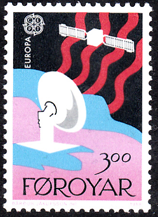 Auf den Färöer-Inseln erschienen die Europamarken 1988 zum Gemeinschaftsthema "Transport- und Kommunikationsmittel" am 11. April 1988. Hier die Marke zu 3,00 Kronen mit der Abbildung eines Satelliten und einer Erdfunkstelle. Die Auflage betrug 819 000 Stück.
