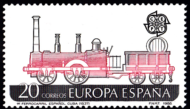 In Spanien erschienen die Europamarken 1988 zum Gemeinschaftsthema "Transport- und Kommunikationsmittel" am 5. Mai 1988. Hier die Marke zu 20 Pta mit der Abbildung der Lokomotive der ersten spanischen Eisenbahnlinle in Kuba (1837), die in einer Auflage von 4 000 000 Stück erschien.