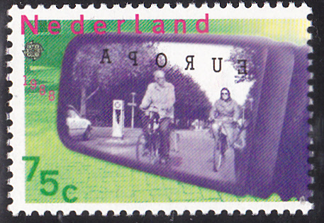 In den Niederlande erschienen die Europamarken 1988 zum Gemeinschaftsthema "Transport- und Kommunikationsmittel" am 17. Mai 1988. Hier die Marke zu 75 Cent mit der Abbildung von zwei Radfahrer im Außenspiegel eines Autos. Die Marke erschien in einer Auflage von 11 448 600 Stück.