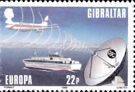 In Gibraltar erschienen die Europamarken 1988 zum Gemeinschaftsthema "Transport- und Kommunikationsmittel" am 16. Februar 1988. Hier eine Marke zu 22 Pence mit einem Flugzeug Boeing 737, dem Fährschiff "Gibline I" und einer Parabolantenne.