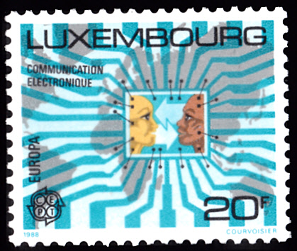In Luxemburg erschienen die Europamarken 1988 zum Gemeinschaftsthema "Transport- und Kommunikationsmittel" am 6. Juni 1988. Hier die Marke zu 20 Franc mit einer Weltkarte und Köpfe im Mikrochip. Die Marke erschien in einer Auflage von 1 000 000 Stück.