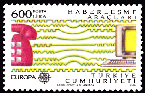 In der Türkei erschienen die Europamarken 1988 zum Gemeinschaftsthema "Transport- und Kommunikationsmittel" am 2. Mai 1988. Hier die Marke zu 600 Lira mit einem Telefon, einem Computer, Wellenlinien und einer Weltkugel. Die Marke erschien in einer Auflage von 600 000 Stück.