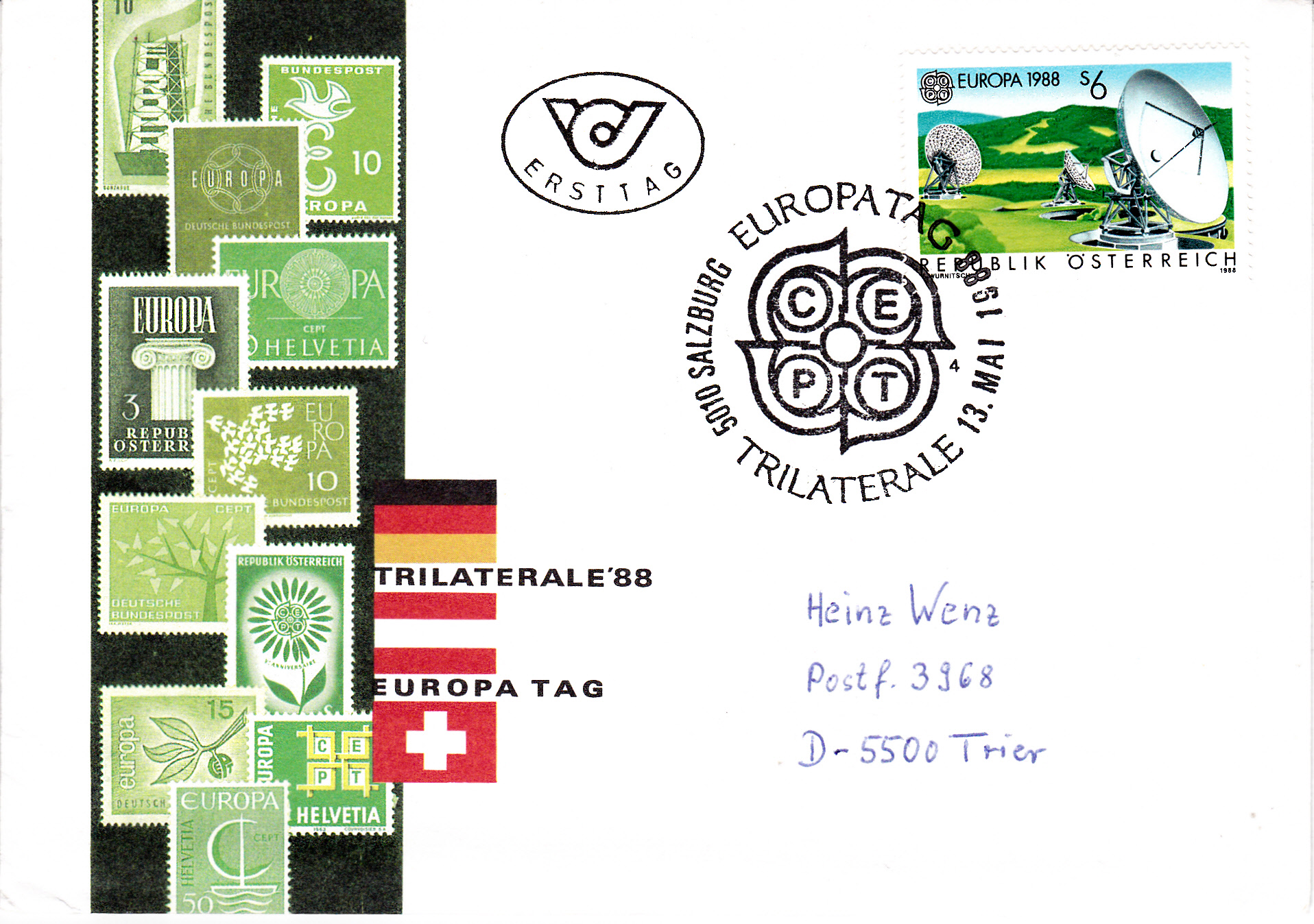 Hier wurde die Europamarke 1988 auf einem Umschlag mit dem gleichen Stempel aus Salzburg am Ersttag entwertet.