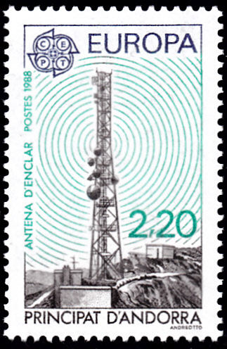 Bei der Französischen Post in Andorra erschienen die Europamarken 1988 zum Gemeinschaftsthema "Transport- und Kommunikationsmittel" am 5. Mai 1988. Hier die Marke zu 2,20 Franc mit dem Funkturm von Enclar. Die Marke erschien in einer Auflage von 538 963 Stück.