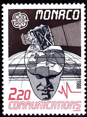 In Monaco erschienen die Europamarken 1988 zum Gemeinschaftsthema "Transport- und Kommunikationsmittel" am 21. April 1988. Hier die Marke zu 2,20 Franc mit einem Satelliten, einem Kopf mit Europakarte und einer Weltkugel.