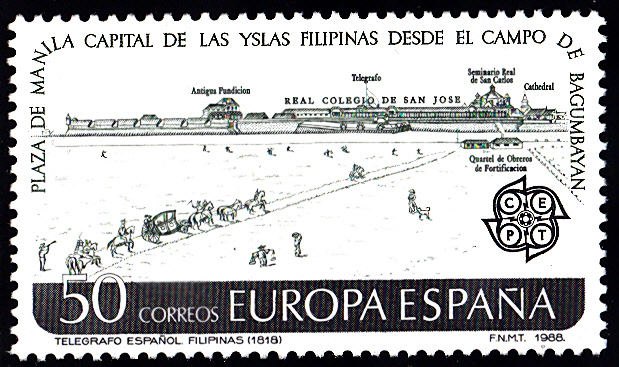 In Spanien erschienen die Europamarken 1988 zum Gemeinschaftsthema "Transport- und Kommunikationsmittel" am 5. Mai 1988. Hier die Marke zu 50 Pta mit der Abbildung der Ansicht von Manila mit optischem Telegraphen spanischer Herkunft (1818), die in einer Auflage von 4 000 000 Stück erschien.