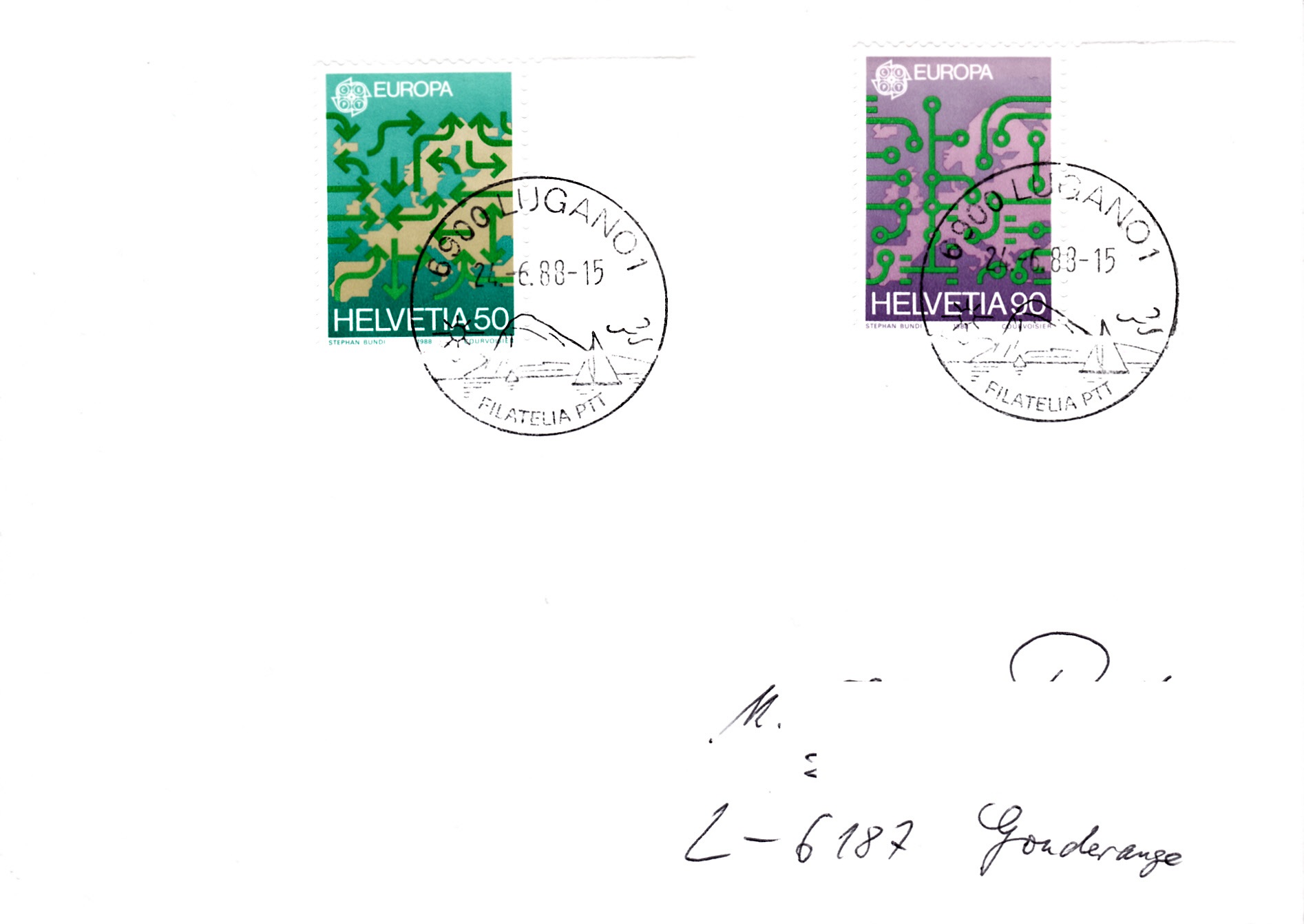 Brief von Lugano nach Gonderange/Luxemburg mit den beiden Europamarken 1988.