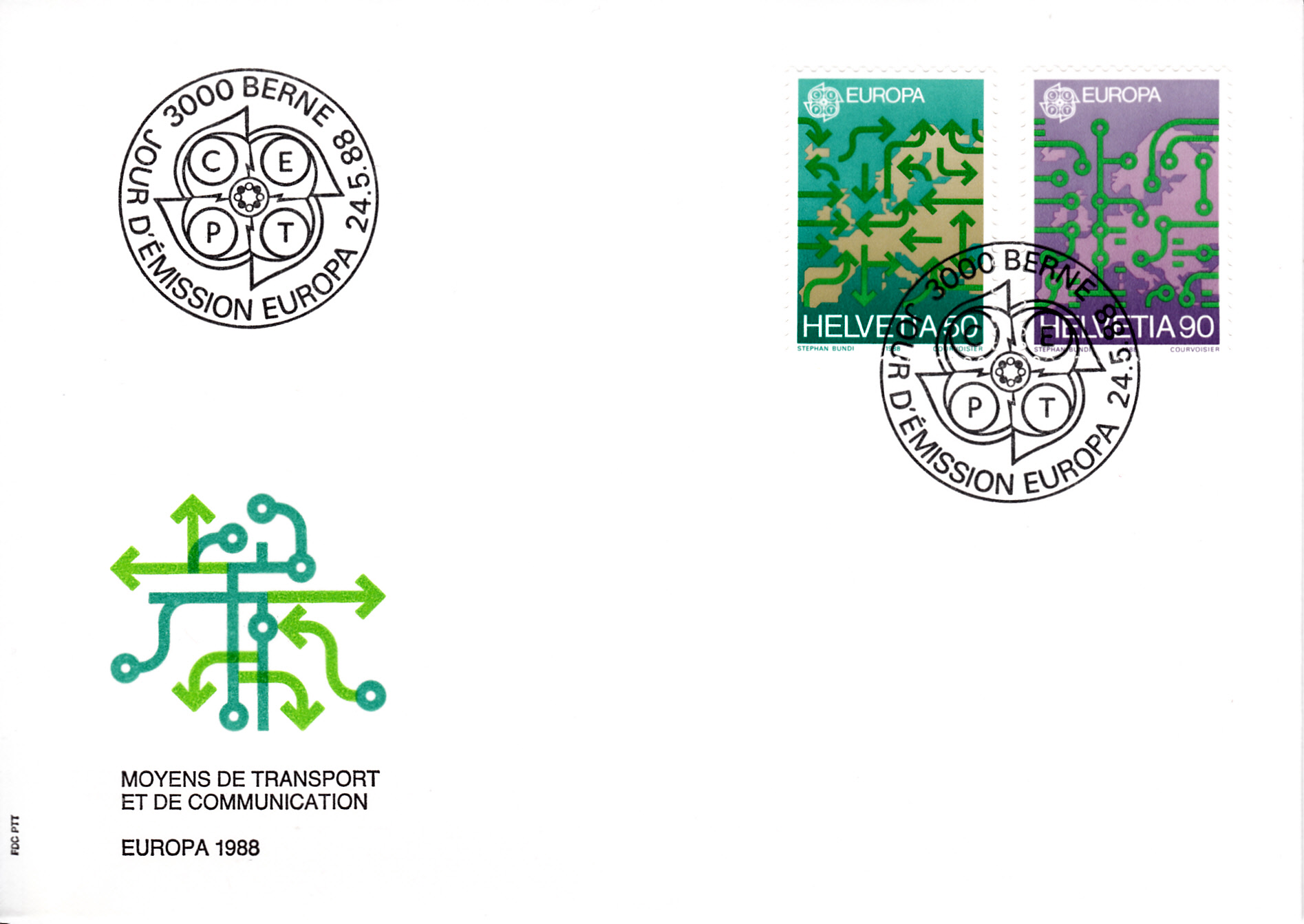 In der Schweiz erschienen die Europamarken 1988 zum Gemeinschaftsthema "Transport- und Kommunikationsmittel" am 24. Mai 1988. Hier die Marke zu 90 Rappen mit der Abbildung einer Landkarte Europas und Schaltungen, die in einer Auflage von 7 460 000 Stück erschien.