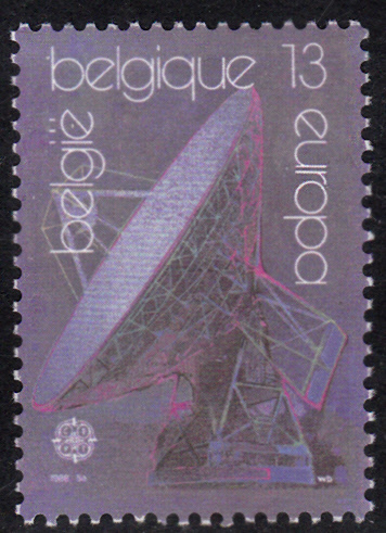 In Belgien erschienen die Europamarken 1988 zum Gemeinschaftsthema "Transport- und Kommunikationsmittel" am 7. Mai 1988. Hier die Marke zu 13 Franc mit der Abbildung einer Parabolantenne, die in einer Auflage von 8 100 000 Stück erschien.