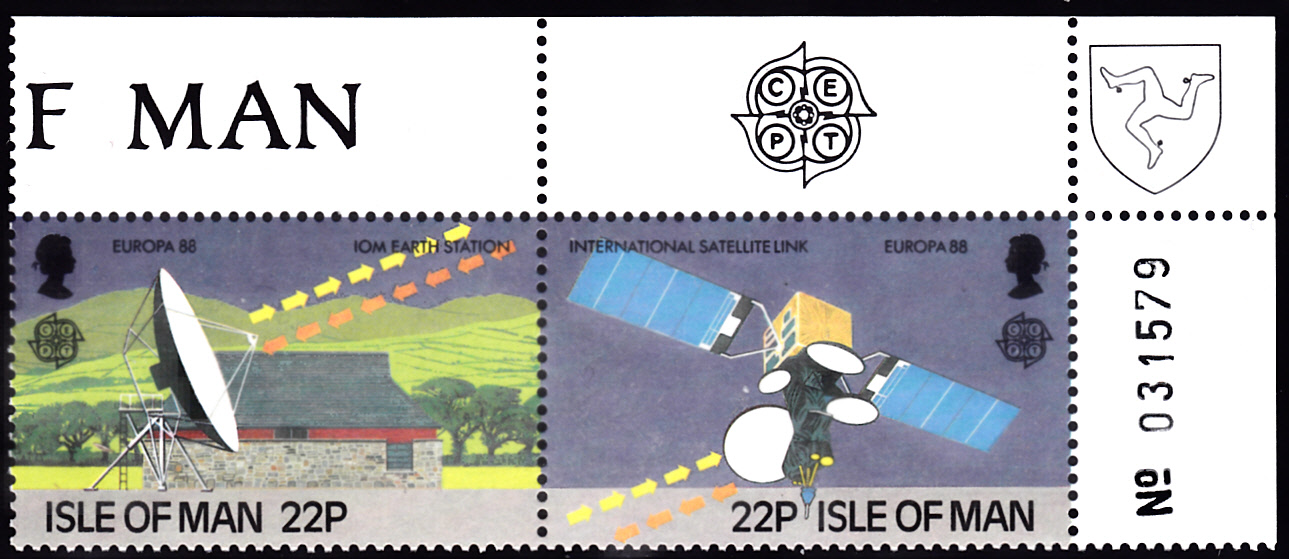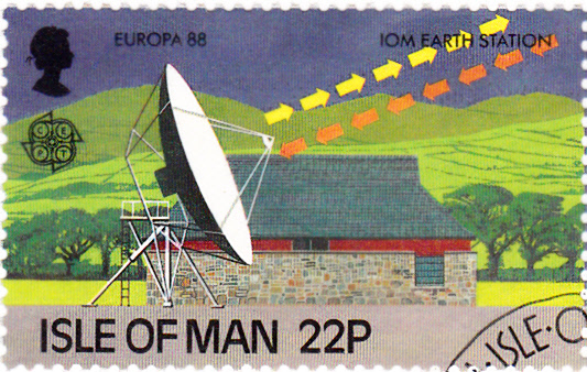 Auf der Insel Man erschienen die Europamarken 1988 zum Gemeinschaftsthema "Transport- und Kommunikationsmittel" am 14. April 1988. Hier die Marke zu 22 Pence mit der Abbildung der Erdfunkstelle in Braddan.