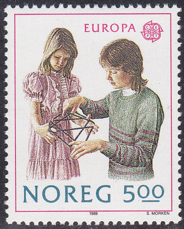 In Norwegen erschienen die Europamarken 1989 zum Gemeinschaftsthema " Kinderspiele" am 7. Juni 1989. Hier die Marke zu 5,00 Kronen mit einer Abbildung beim "Fadenspiel". Die Auflage dieser Marke betrug 3 047 478 Stück.